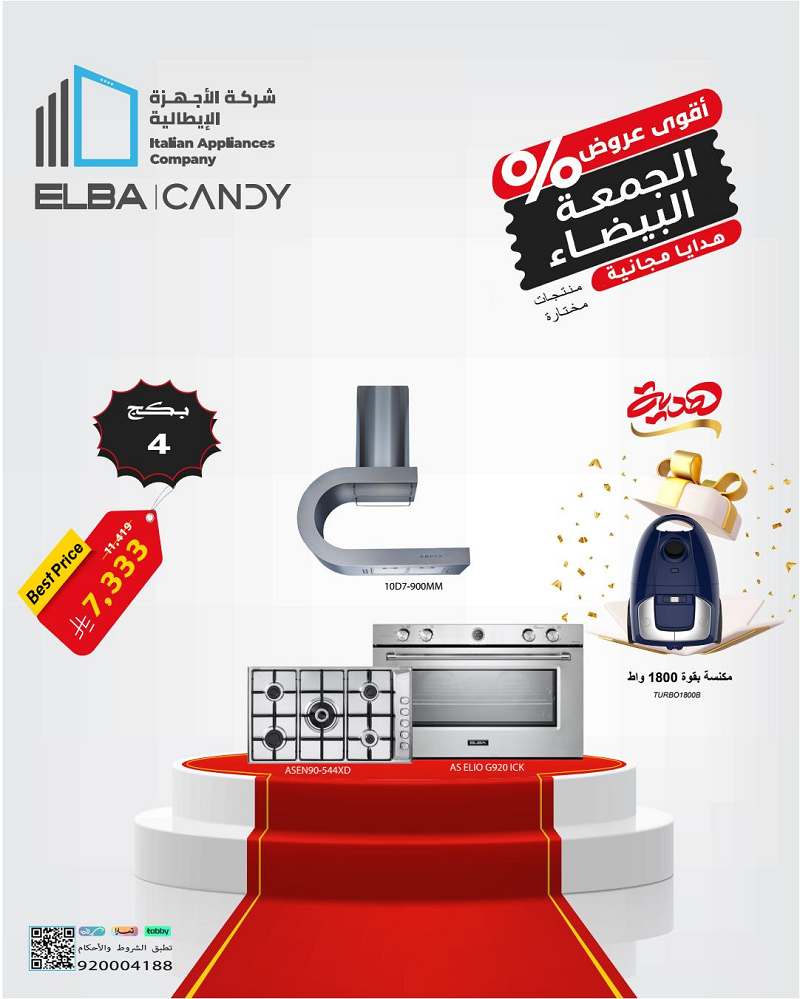 بكج الجمعة البيضاء 5 (فرن البا 90 سم كهرباء أبيض + موقد + شفاط + مايكرويف) (غلاية+محمصة خبز+صانعة القهوة هدية)