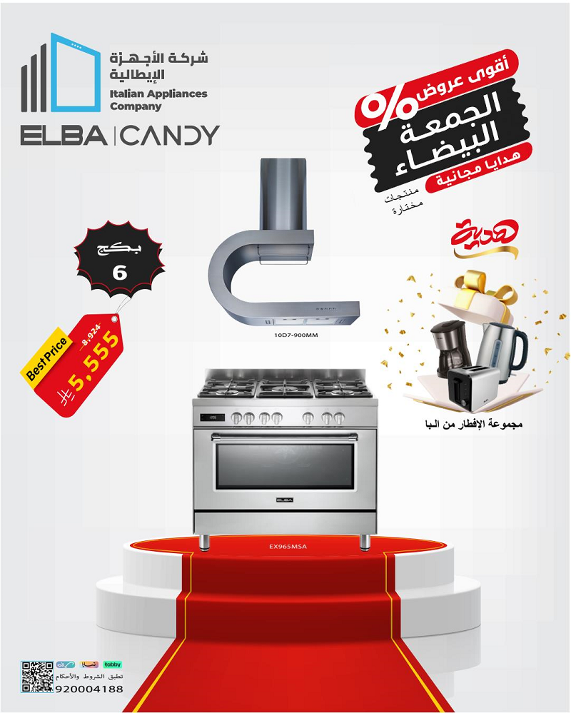 بكج الجمعة البيضاء 5 (فرن البا 90 سم كهرباء أبيض + موقد + شفاط + مايكرويف) (غلاية+محمصة خبز+صانعة القهوة هدية)